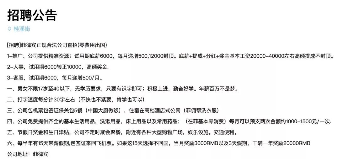 《21CBR》记者查询发现,网上仍有打着正规合法公司旗号疑似“诈骗”的招聘信息。有菲律宾的相关招聘公告,直接宣称“年薪百万不是梦”,入职仅要求17-40岁以下,会识字、能打字。不少公司给出丰厚薪资待遇,强调能提供“精准资源”,工作地点注明在马卡蒂、趴赛等地区,它们是博彩公司的聚集地。