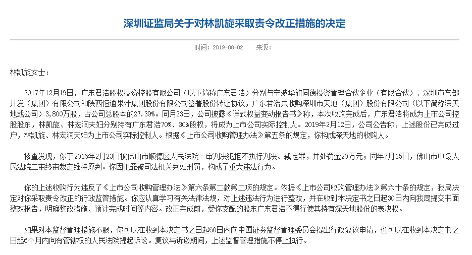 证监局要求,林凯旋对上述违法行为进行整改,改正完成前,受林凯旋支配的股东广东君浩不得行使其持有深天地股份的表决权。