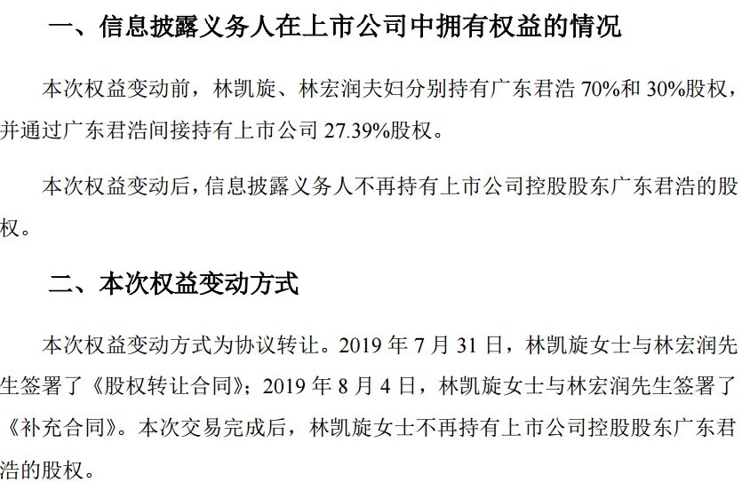 8月7日,深天地A发布的权益变动报告书显示,林凯旋不再持有上市公司控股股东广东君浩的股权。