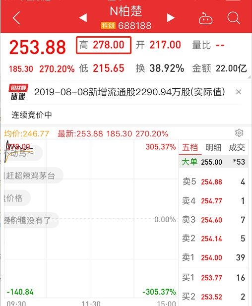 柏楚电子278元也创出科创板史上最高股价,此前科创板历史最高价是N安集上市首日的243.2元。