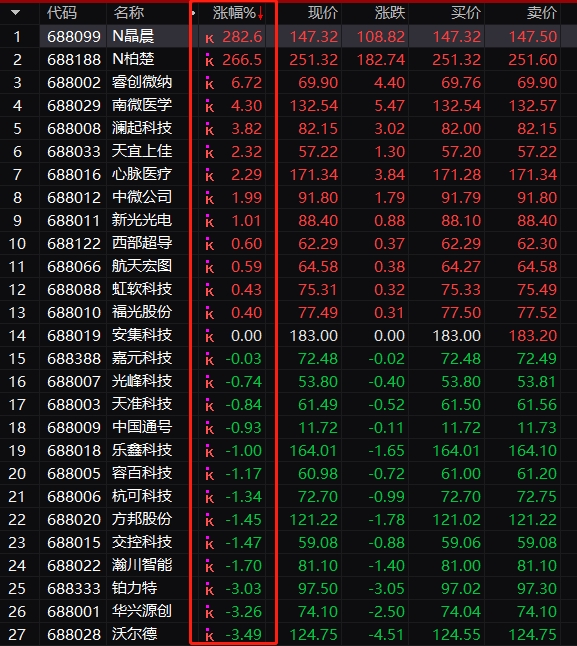 或许由于只有2只新股,今天新股涨幅明显超过首日平均表现。晶晨股份与柏楚电子2只新股今日开盘涨幅都超200%,然后快速冲高涨幅都超过300%。而首批25只科创板开市首日的开盘价平均涨幅未140.95%。