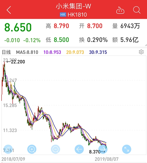 虽然雷军成为了科创板赢家,但小米集团在港股市场股价却已腰斩。去年7月上市发行价17港元,然而快速冲高到22港元,而今截至昨日收盘股价为8.65元港币,较发行价几近腰斩。