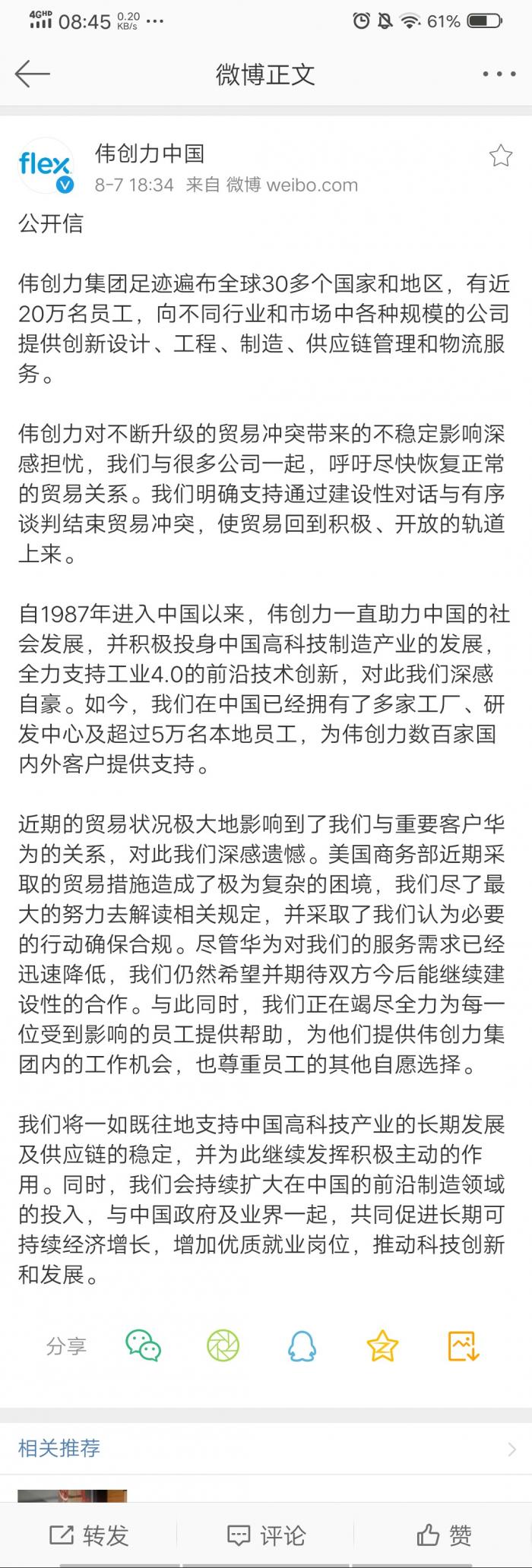 8月7日(周三)晚间,伟创力中国发表公开信,回应与华为的业务往来情况。