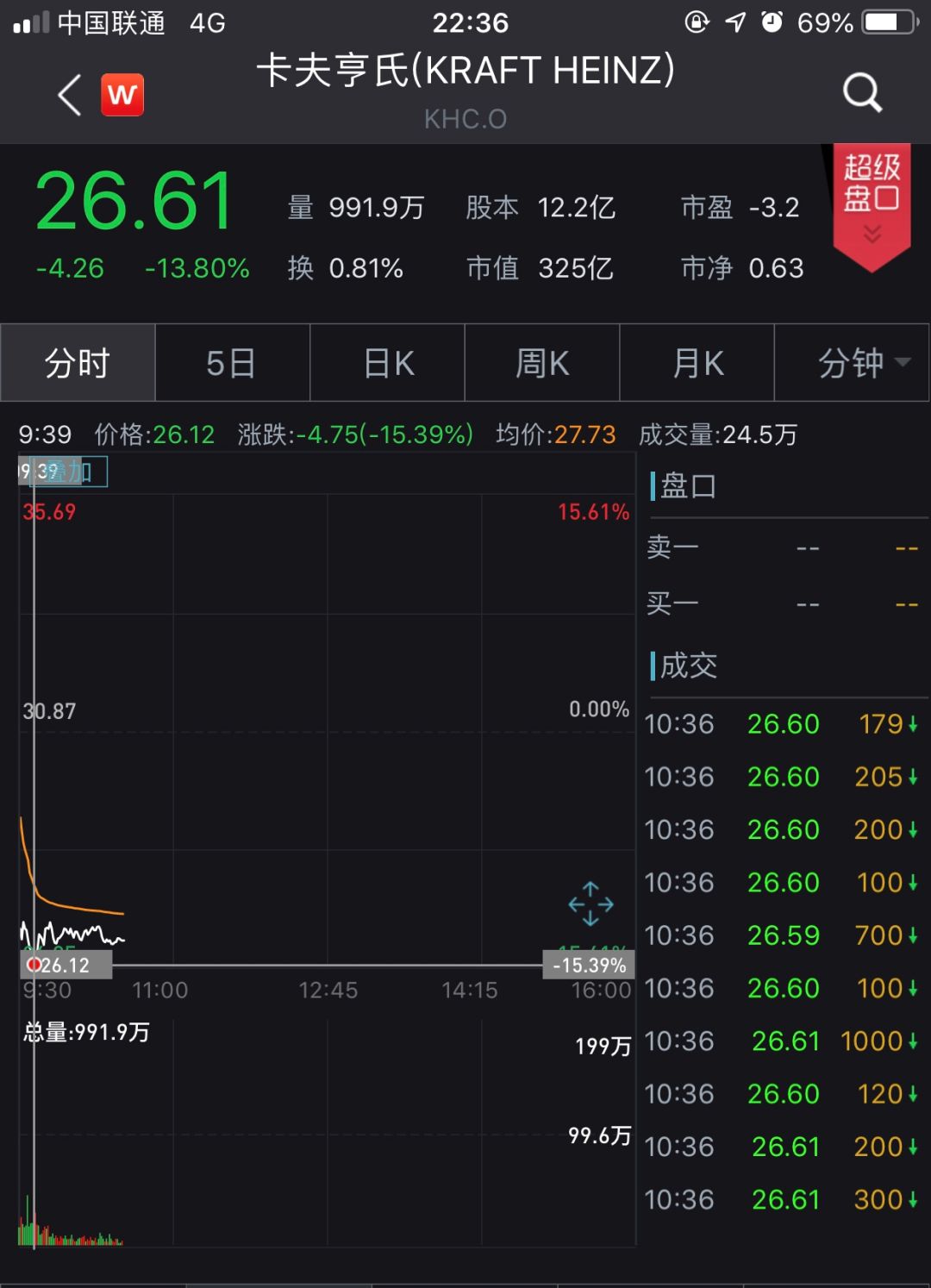 当时受财报利空影响,卡夫亨氏深跌超27%至历史低价,至少六家投行下调评级。而作为卡夫亨氏的第一大股东巴菲特,单日账面价值缩水43亿美元,近300亿人民币。