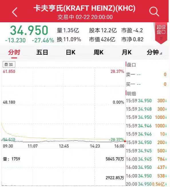 消息公布后,卡夫亨氏盘前股价大跌,今晚开盘后继续下跌,股价一度暴跌15%,市值缩水56亿美元左右,约合人民币400亿元。