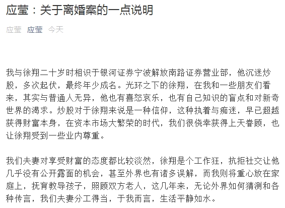 虽然,目前仍无法确认,此应莹就是股神徐翔之妻,但从文章的内容来看,的确与徐翔案有着高度的重合度,而且其中细节亦只有详知内情的人才能获知。因此,该公告存在较大的可能性就是徐翔之妻应莹所开。在该文中,“应莹”就徐翔及徐翔案进行了较为细致的披露。同时清晰的表达了自己的诉求:即要求法院尽快甄别涉案资产,离婚。应莹还表示,这几年她已经精神透支。
