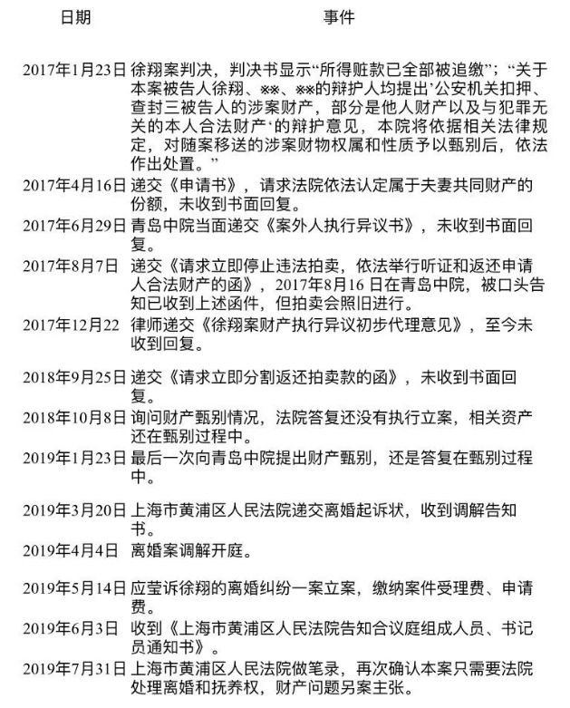 2019年4月1日,应莹决定起诉离婚。当时,这一消息霸占了各大公号头条。4月2日,徐翔妻子应莹向媒体提供了离婚起诉状,其向上海市黄浦区人民法院提起四点诉讼请求:判令应莹和徐翔离婚,判令双方所生之子由应莹抚养,请求依法分割夫妻共同财产,本案诉讼费由徐翔承担。