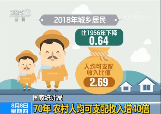 新中国成立70年来,农村居民收入持续较快增长,城乡收入差距明显缩小。报告显示,2018年城乡居民人均可支配收入比值为2.69,比1956年下降了0.64。与此同时,农村居民消费水平不断提高,恩格尔系数持续下降。报告显示,2018年农村居民人均消费支出12124元,扣除物价因素,比1949年实际增长32.7倍,年均实际增长5.2%。农村居民恩格尔系数为30.1%,比1954年下降了38.5个百分点。