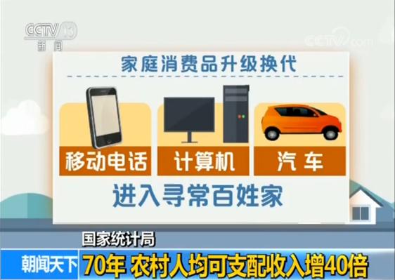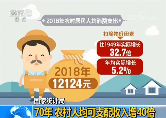 国家统计局发布了新中国成立70周年经济社会发展成就报告。报告显示,2018年农村居民人均可支配收入14617元,扣除物价因素,比1949年实际增长40倍,年均实际增长5.5%。