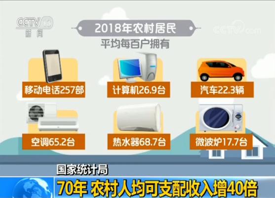 此外,家庭消费品升级换代,移动电话、计算机、汽车进入寻常百姓家。报告显示,2018年农村居民平均每百户拥有移动电话257部、计算机26.9台、汽车22.3辆、空调65.2台、热水器68.7台、微波炉17.7台。农村居民人均住房建筑面积达到47.3平方米,比1978年增加39.2平方米。