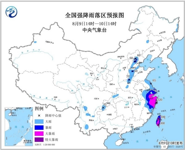 中央气象台今早10点升级发布暴雨橙色预警 暴雨席卷10余省:预计,8月9日14时至10日14时,浙江、福建北部、江苏东部和南部、上海、安徽东南部、台湾岛以及北京、河北中南部、河南中部、重庆西南部和北部、四川南部、云南中北部、黑龙江东部等地的部分地区有大到暴雨,其中浙江中东部、上海南部以及台湾岛等地有大暴雨,浙江东部和台湾岛中部局地有特大暴雨(250~320毫米)。上述部分地区伴有短时强降水(最大小时降雨量20~50毫米,局地可达70毫米以上),局地有雷暴大风等强对流天气。