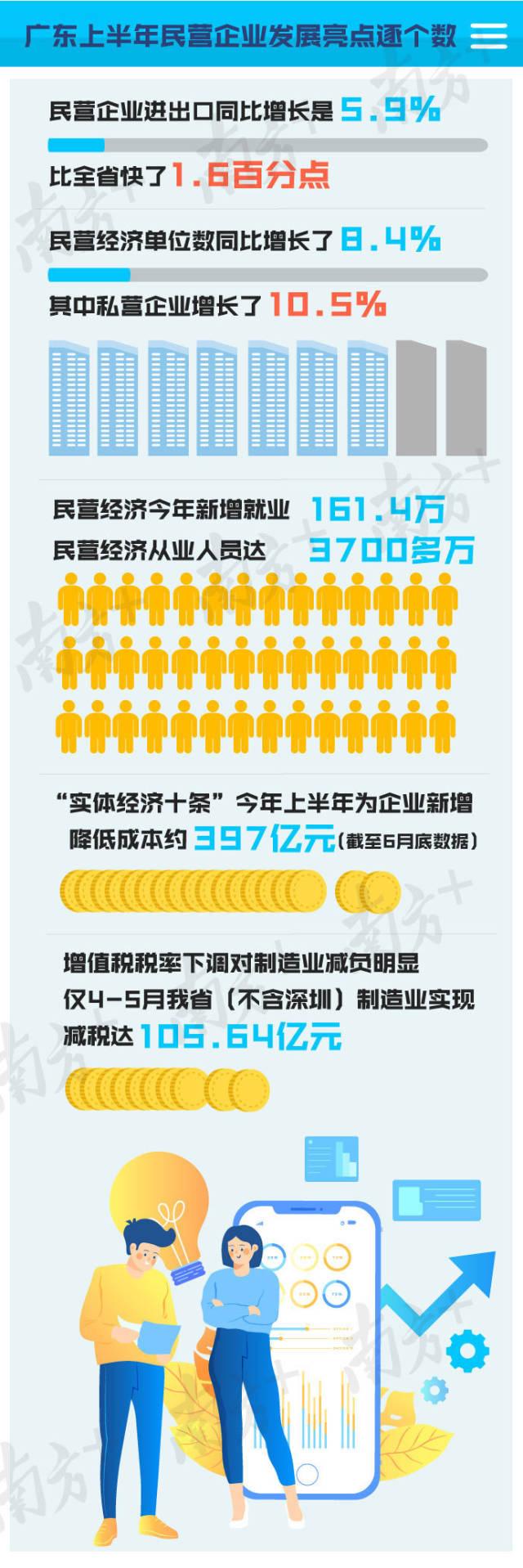 有料哥在刚放发布的广东半年数据里找到了答案:上半年规上民营工业的增长是7.5%,比全省快2.7个百分点。民营企业进出口同比增长5.9%,这个也较全省快了1.6个百分点,此外,民营经济单位数同比增长了8.4%。