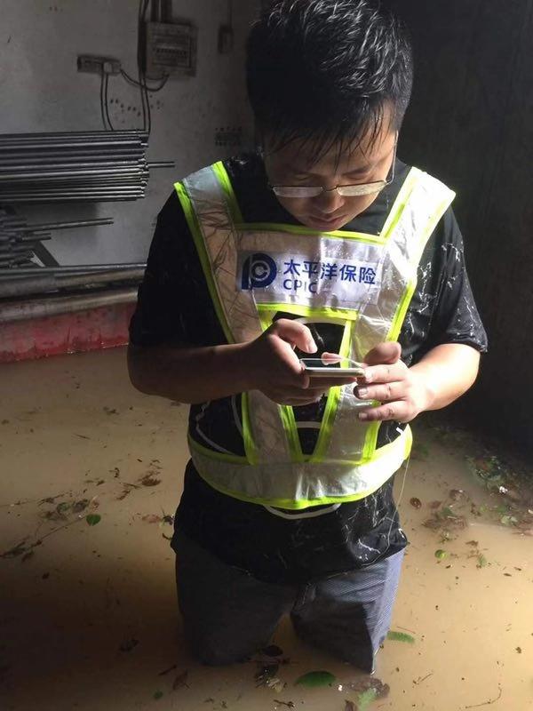 保险查勘员在一线。8月10日清晨7时42分,温州龙湾一受损车查勘现场。大雨倾盆,水中夹杂着工厂废料,中国太保查勘员李辉徒步进入水淹区域开展工作,最终帮助受灾车辆顺利脱困。