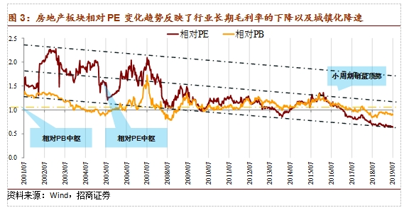 这种变化,也充分反映在资本市场上,如图3,资本市场对房地产行业的相对定价呈现下行趋势,这反映了行业长期毛利率的下降以及房地产行业周期属性增强而成长属性减弱的现实,资本市场是聪明的。