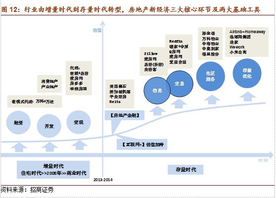 如图12,三大核心环节(交易&信息/社区/存量优化)及两大基础工具(金融/互网+)是行业成长股摇篮。从近年观察,基于信息的交易,社区服务,和存量资源优化是三个转型的核心环节,这些环节和过去的多元化转型不同,他们都没有脱离房地产行业本身。