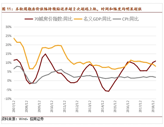 住房补贴工业,反映到过去就是房价问题一定程度上可以被经济增长所掩盖,扭曲的土地供给制度之弊病还未完全暴露。随着城镇化速度的放缓,经济增长的中枢(潜在增速)亦开始回落,而土地供需关系的矛盾仍然在加剧,表现为房价的涨幅脱离了经济增长的中枢独自而上。如图11,中长期看,房价涨幅的上限是名义GDP增速,下限是CPI增速,而本轮周期,房价涨幅持续贴近并超2次超越上轨,时间和幅度均明显超涨,房价的“高估值”需要时间消化。这种背景下,调控房价的重要性变得非常高。