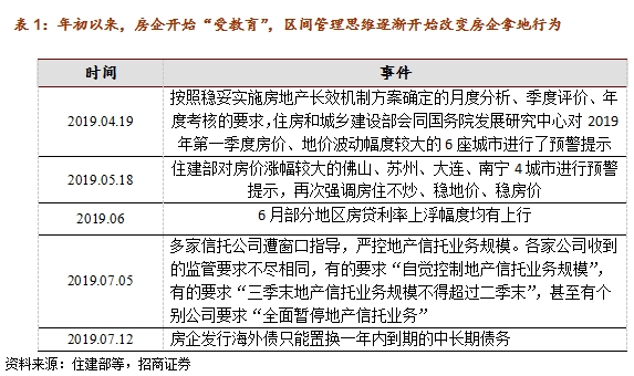 “一刀切”式政策或一去不复返,“区间管理”或是常态,今年以来,“区间管理”模式开始“教育”市场,房企拿地的行为开始调整和进化。去年以来,随着宏观市场利率的下行,市场仍按照过往周期的节奏出牌,房企开始加量拿地,但事实也告诉大家,这次仿佛有点不一样。如表1所示,年初以来,热点城市房价上涨过快被点名,从而应城施策式收紧;另有传言部分房企因为参与地王或违规资金拿地被暂停公开市场融资,虽然暂未看到正式文件,但这些变化和可能的窗口指导足以改变和影响房企的拿地节奏,过去,许多房企负责人紧盯策略变化,想等待“一刀切”式的放松从而下注,或许,他们也感觉到了一些不一样的气味。