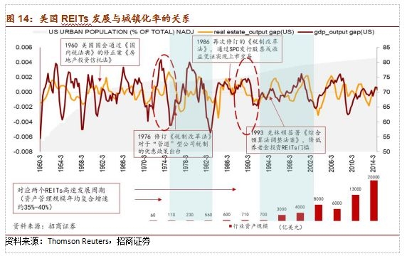 我们看到,美国的REITs法案是在行业进入特定阶段后才颁布,这个特定阶段,就是城镇化跨越70%(1960S),之后,开启了两段REITs高速成长期(图14)。