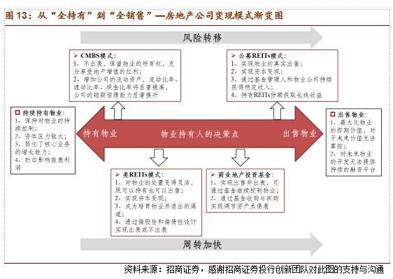 如图13,CMBS是最简单的融资方式,同时转移了部分风险,由于抵押率低,实现周转的效率有限,但成本较低;而最近很火的类REITs产品抵押率高(出表或不出表),开发商目前愿意补贴收益率来提高周转,尤其是针对商业类的扩张;而REITs则实现了完全出表和永续交易,已经接近全部出售的状态(为了保持控制权通常开发商保留30%左右的股份)。