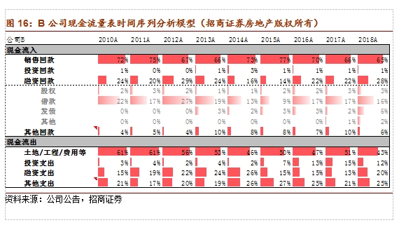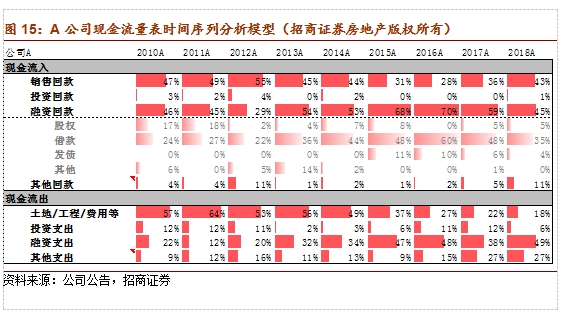 商业模式面临重大考验。谁会胜出?过去积累了数年“制造业”能力风格的房企将胜出。既然95%的房企是以Martingale策略进行拿地布局的,那剩下的5%是什么呢?这5%的房企有什么特点,首先看看他们的现金流量表时间序列的形式: