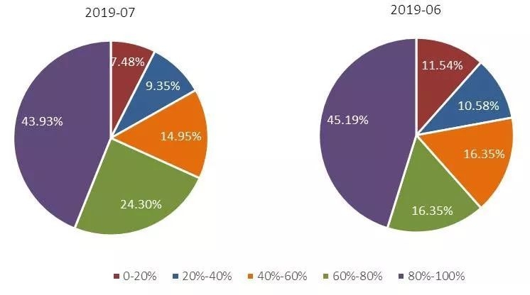 具体来看,截至7月末,股票持仓超过五成的成分基金比例为78.5%,较上月末上升9.27个百分点。乐观的投资经理(仓位80%-100%)与谨慎的投资经理(仓位60%以下)占比都有所减少,持仓向中部靠近(仓位60%-80%)。