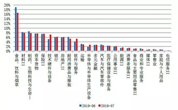 7月,科技股成为不少私募的心头好。但值得注意的是,食品、饮料与烟草行业近两年被持续增持,目前仍是配置比例最高的行业,并且远高于排名第二的材料行业。