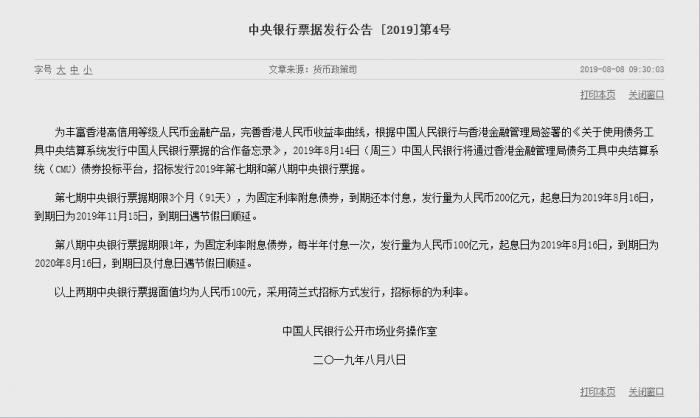 8月14日,央行在香港发行两期人民币央行票据,总发行量为300亿元,其中3个月期央行票据200亿元,1年期央行票据100亿元。
