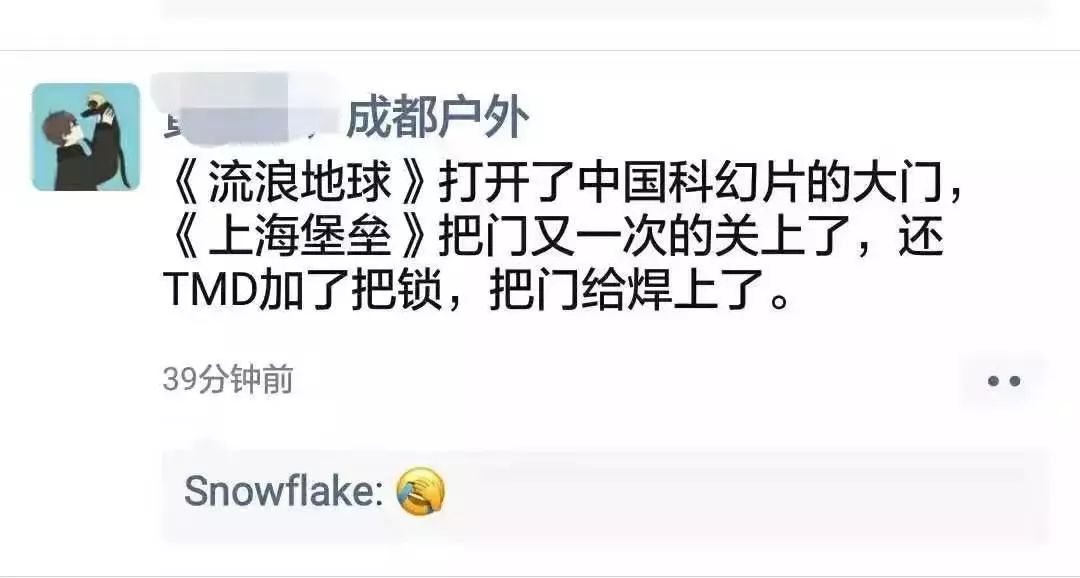 也许正如失望的观众所言:《流浪地球》打开了中国科幻片的大门,《上海堡垒》把门又一次的关上了,还TMD加了把锁,把门给焊上了。