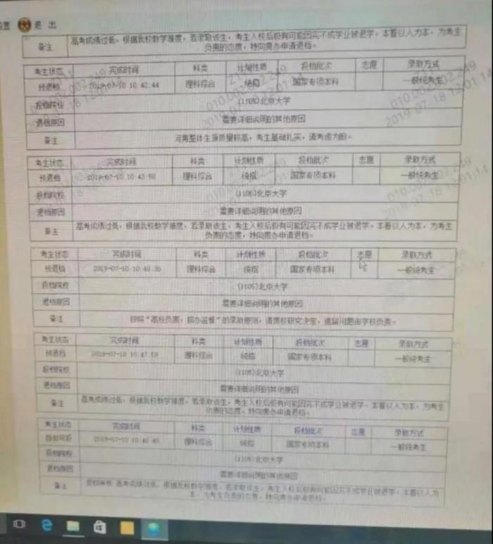 ▲ 网上流传出疑似来自考生查询系统的北大三次退档截图(资料图)