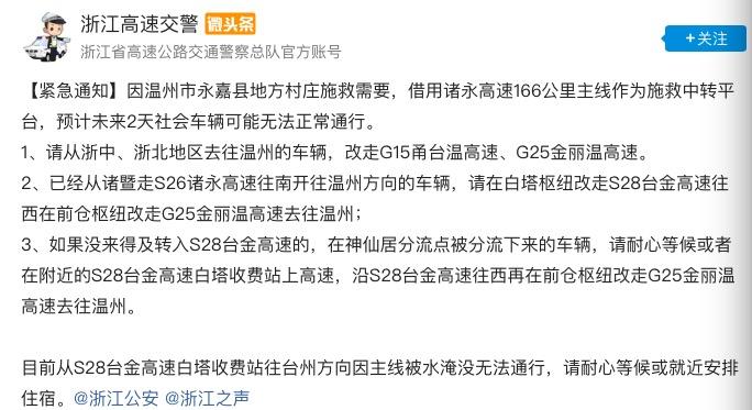 “1、请从浙中、浙北地区去往温州的车辆,改走G15甬台温高速、G25金丽温高速。