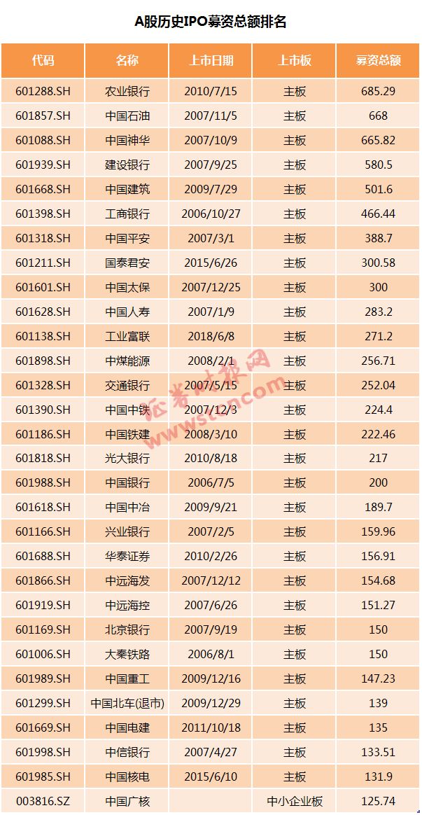 从历史数据显示,50.5亿股的新股发行数量在A股历史上能排到第7位,排在前面的是农业银行、工商银行、中国建筑、建设银行、光大银行、中国银行。