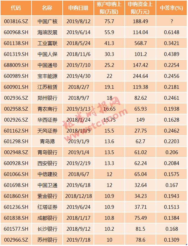 记者统计数据发现,新股中签率与新股网上发行申购上限成正相关。2018年以来,申购上限达10万股或以上的新股一共有20只(不含中国广核)。此前申购上限最高的是海油发展,其中签率也最高,达0.6148%。