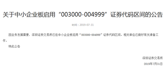 此前深交所公布因业务发展需要,已在中小企业板启用"003000-004999"证券代码区间,相关单位已做好有关准备工作。