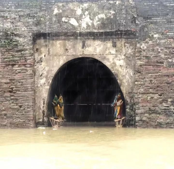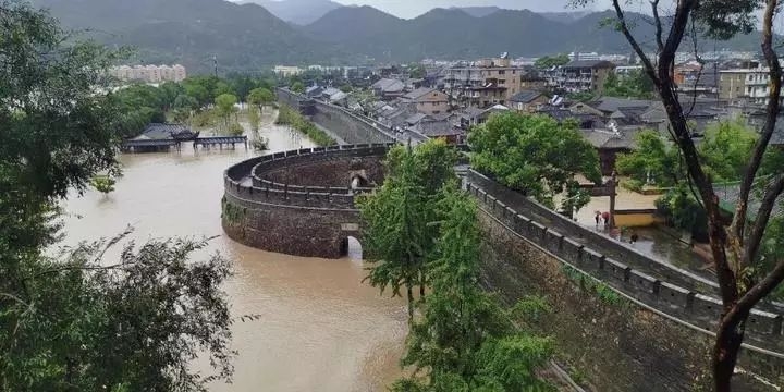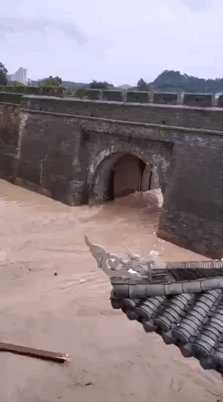 10日下午临海古城受灾严重城门已“失守”洪水涌进城内