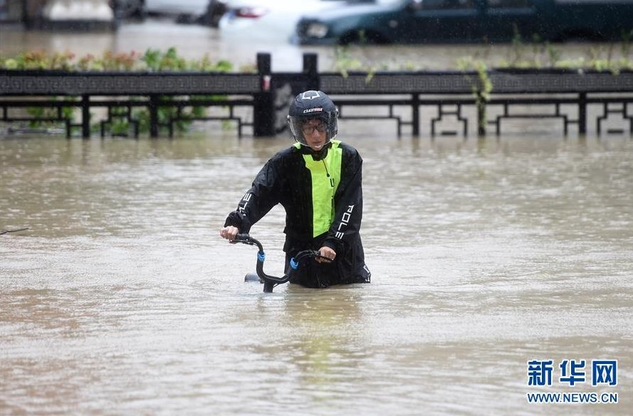 8月10日,温岭市太平街道一名行人横穿积水严重的马路。新华社