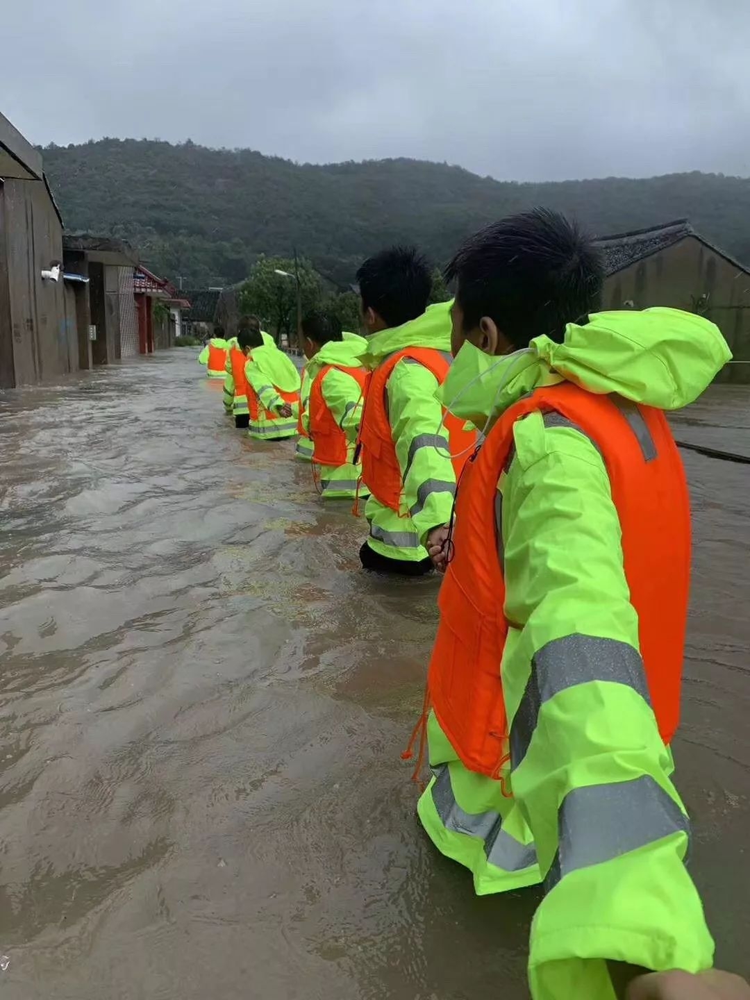 宁波北仑区春晓街道春晓派出所民警正在转移受困群众由于积水已经过腰他们手拉手前行