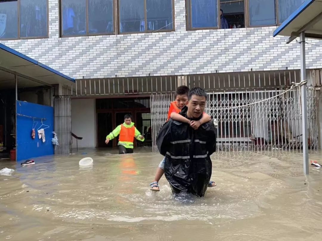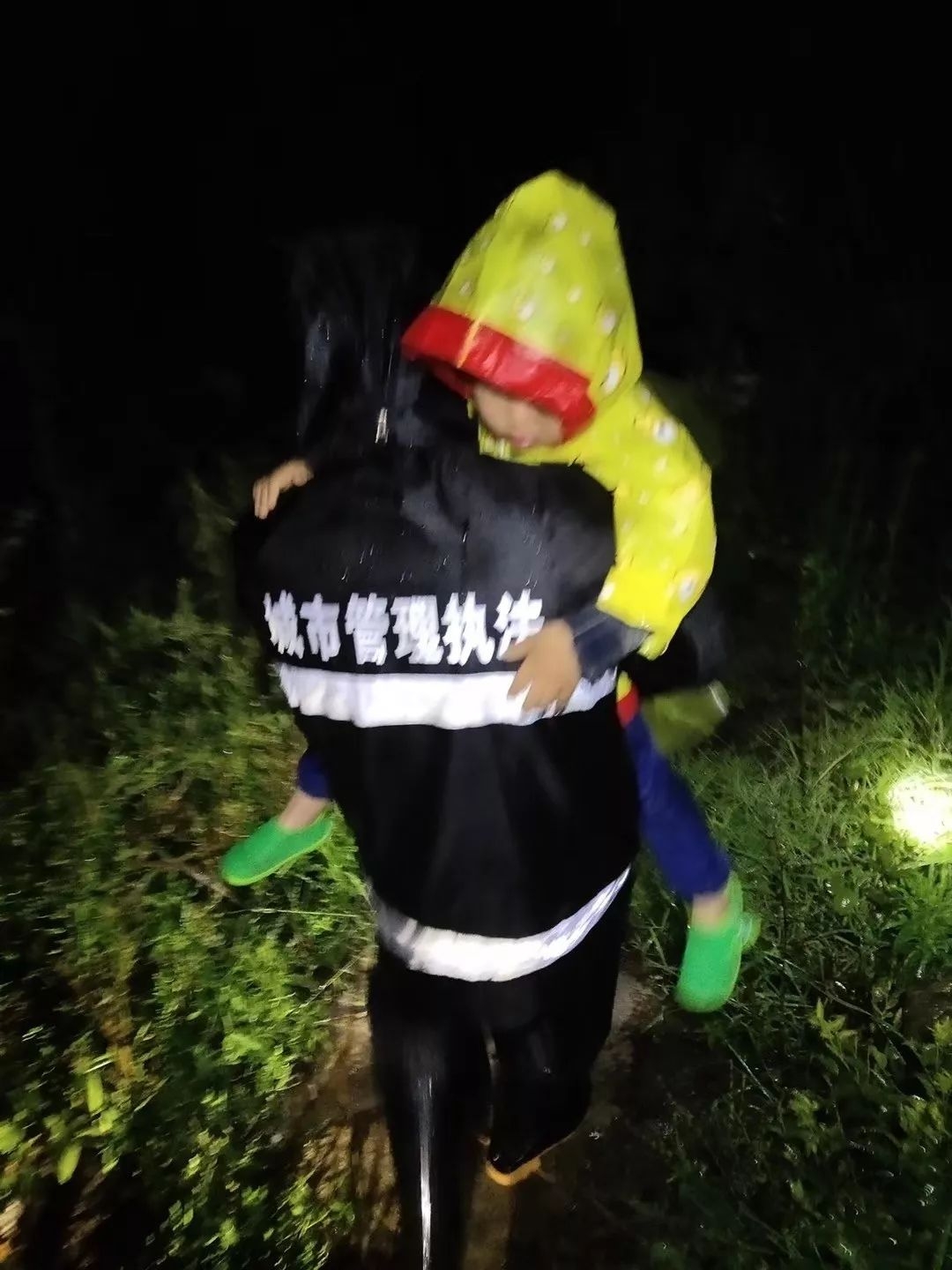 在宁波北仑区一位民警背着一名儿童向安置点转移