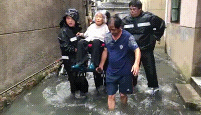 在舟山市定海区昌国街道留方社区一老太太家里被淹而她的孩子也在抗风救灾无法照顾她社区干部和城管队员把她护送到安置点休息