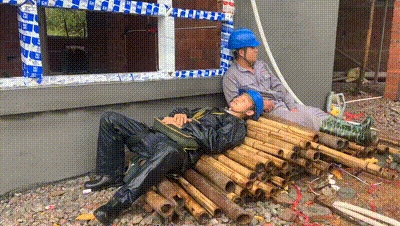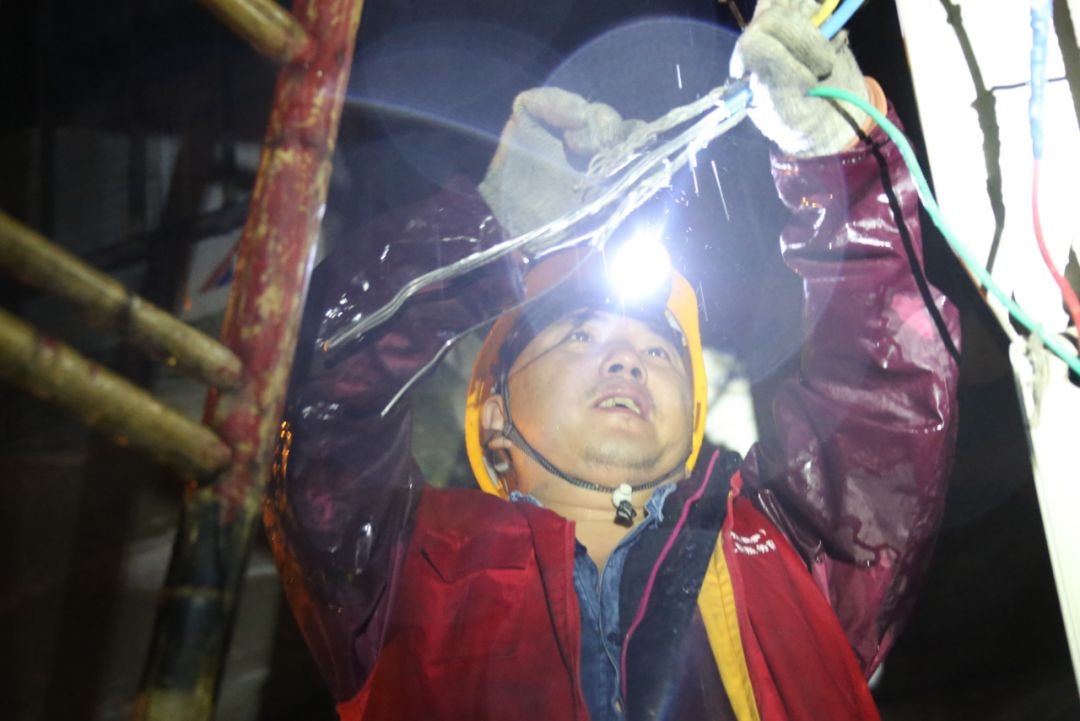 在金华市永康市石柱镇电力工人在坚守了17个小时后直接在地上睡着了