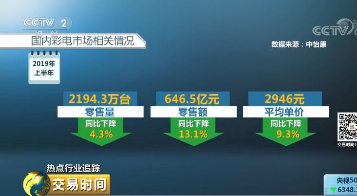 根据中怡康数据显示,上半年国内彩电零售量2194.3万台,同比下跌4.3%;零售额646.5亿元,同比下降13.1%;平均单价2946元,同比下降9.3%。