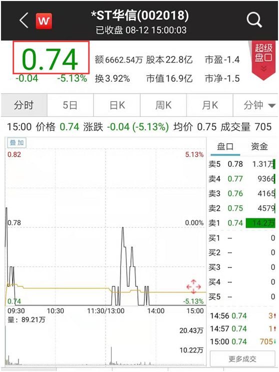 算上今日,*ST华信已经连续16个交易日收盘价低于1元面值。而按照今天0.74元的收盘价,即便*ST华信在未来4个交易日连续涨停,都将触及连续20个交易日收盘价低于1元的面值退市规定。