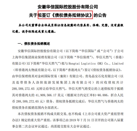 8月1日晚间,*ST华信公告表示,公司子公司华信保理、华信天然气拟与Hongtai Logistics (HK) Co., Limited (即香港鸿太)签订《债权债务抵销协议》, 由华信保理将其对金砖国际贸易(襄阳)有限公司、青岛晶安石化有限公司(以及连带债务人洛阳旅游发展集团上海 有限公司) 的应收债权共计2.89亿元转让给华信天然气,华信天然气将受让的上述债权用于抵销其对香港鸿太的4190.96万美元(根据双方约定汇率$1=¥6.886,折合人民 币2.89亿元)债务。债权债务抵销完成后,华信天然气与香港鸿太的债权债务在抵销范围内全部消灭。 *ST华信表示,以上债权债务抵销事项,预计将增加合并报表归属于母公司所有者净利润以及归属于母公司所有者权益。 不过这个动作很快引来深交所关注。当晚,深交所向公司下发关注函,要求认真核实并补充说明多个问题,包括结合本次债权债务抵销的合理性和商业逻辑,说明公司是否存在利用信息披露影响股票交易、抬拉股价的情形,并请独立董事发表意见。 深交所要求公司在2019年8月5日前将有关说明材料报送深交所中小板公司管理部,并对外披露,同时抄报安徽证监局上市公司监管处。 不过,*ST华信延期到了8月10日才回复了这份关注函。而在此之前,8月6日晚间,公司公告表示,在推动本次债务抵销事项过程中,经公司与有关方沟通讨论后,认为目前时机尚不成熟,不具备履行协议内容的条件。决定终止签订《债权债务抵销协议》。