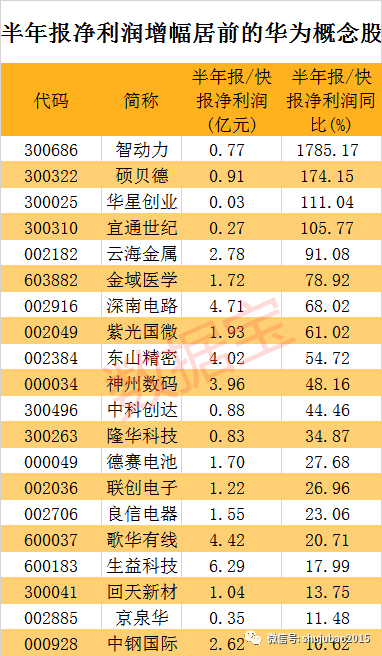 根据目前华为概念股披露的半年报及快报数据来看,绝大部分公司上半年为盈利状态,且同比增长公司占比接近八成。数据宝统计显示,多只华为概念股上半年净利润翻倍增长,分别是智动力、硕贝德、华星创业、宜通世纪。华为核心供应商如深南电路、东山精密、中科创达、德赛电池、生益科技等净利润增幅均超过15%。