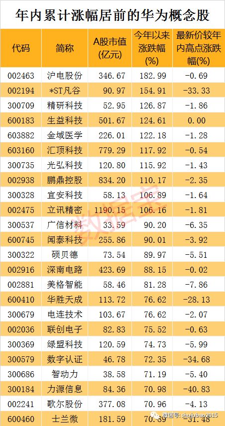10只华为概念股年内涨幅翻倍,其中沪电股份累计涨幅182%排名榜首。公开资料显示,沪电股份主导产品为应用于通讯、通信设备以及汽车的印制电路板,华为是公司重要的客户之一。公司预计上半年净利润为4.4亿元至5亿元,同比增长123%至154%。