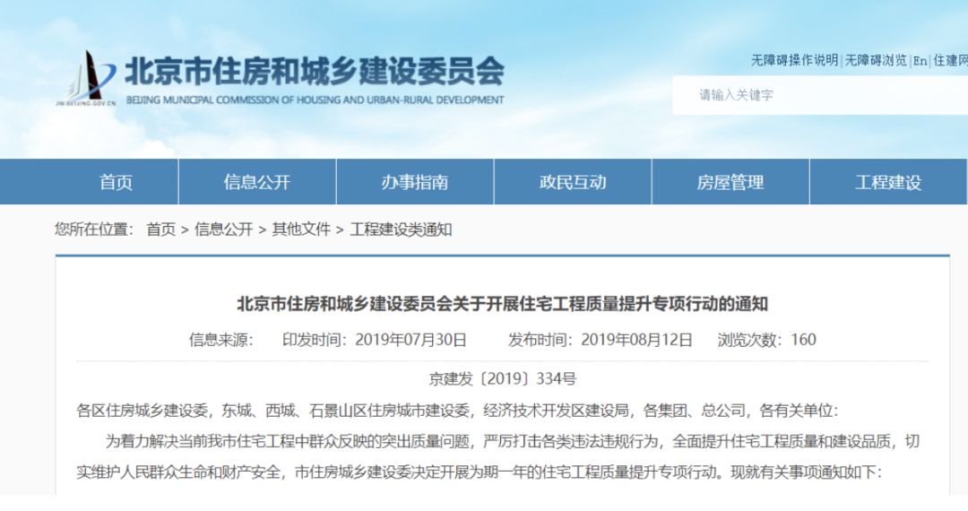 今日(8月12日),北京市住建委发布《关于开展住宅工程质量提升专项行动的通知》(下称《通知》),“决定开展为期一年的住宅工程质量提升专项行动”。
