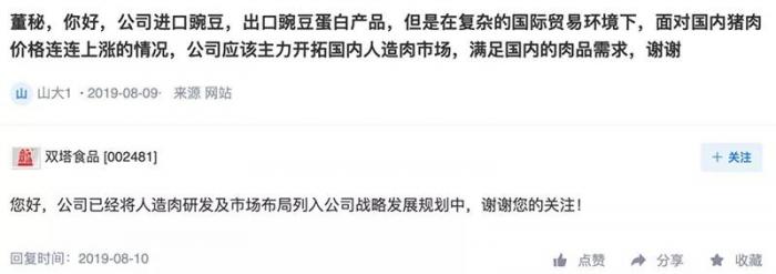 双塔食品刚于8月10日在深交所互动易上表示:公司已经将人造肉研发及市场布局列入公司战略发展规划中。