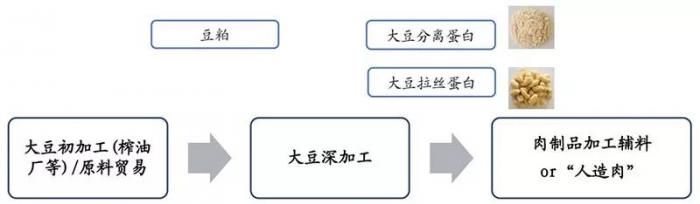 国内“人造肉”概念公司也主要是涉及豆制品,因而产业链上游为大豆初加工企业(通常为向榨油厂购买豆粕)或为原料贸易商,中游为豆制品深加工(大豆蛋白生产),下游应用则是一方面销售给食品加工企业用作辅料,另一方面供给素食肉类生产商制作“人造肉”。