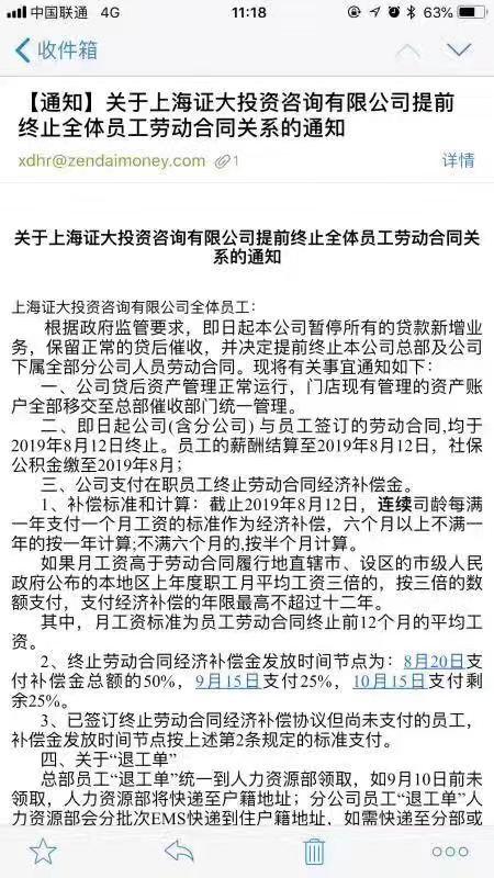 该份通知称,根据政府监管要求,即日起本公司暂停所有的贷款新增业务,保留正常的贷后催收,并决定提前终止本公司总部及公司下属全部分公司人员劳动合同。