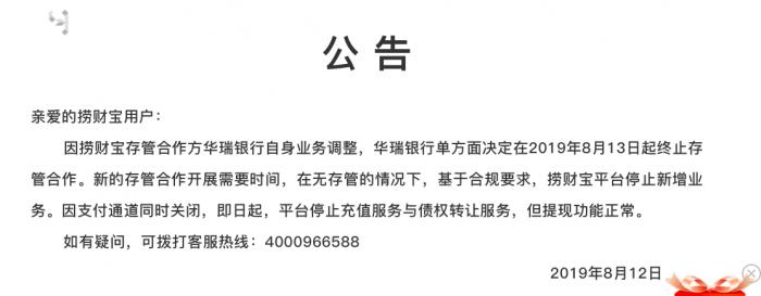 “因捞财宝存管合作方华瑞银行自身业务调整,华瑞银行单方面决定在2019年8月13日起终止存管合作。新的存管合作开展需要时间,在无存管的情况下,基于合规要求,捞财宝平台停止新增业务。因支付通道同时关闭,即日起,平台停止充值服务与债权转让服务,但提现功能正常。”捞财宝在公告中称。