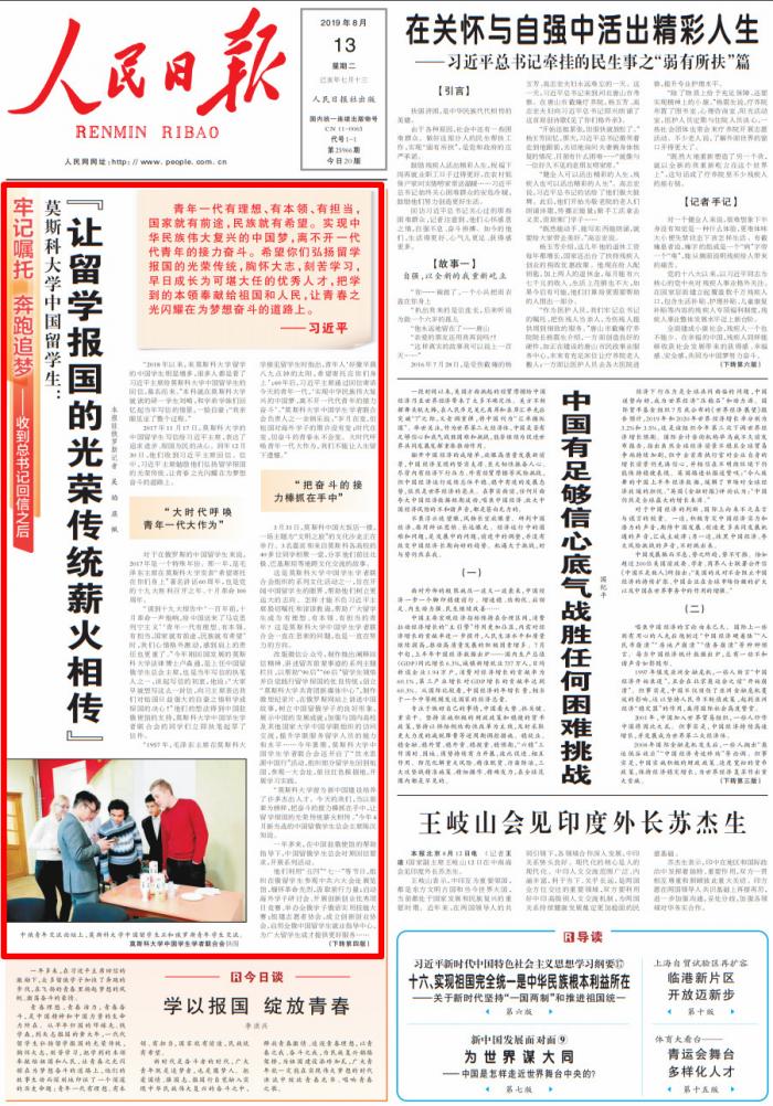 人民日报推出“牢记嘱托 奔跑追梦——收到总书记回信之后”系列报道,与您一起见证发展变化、感悟初心使命。今天刊发第十一篇《莫斯科大学中国留学生:“让留学报国的光荣传统薪火相传”》。